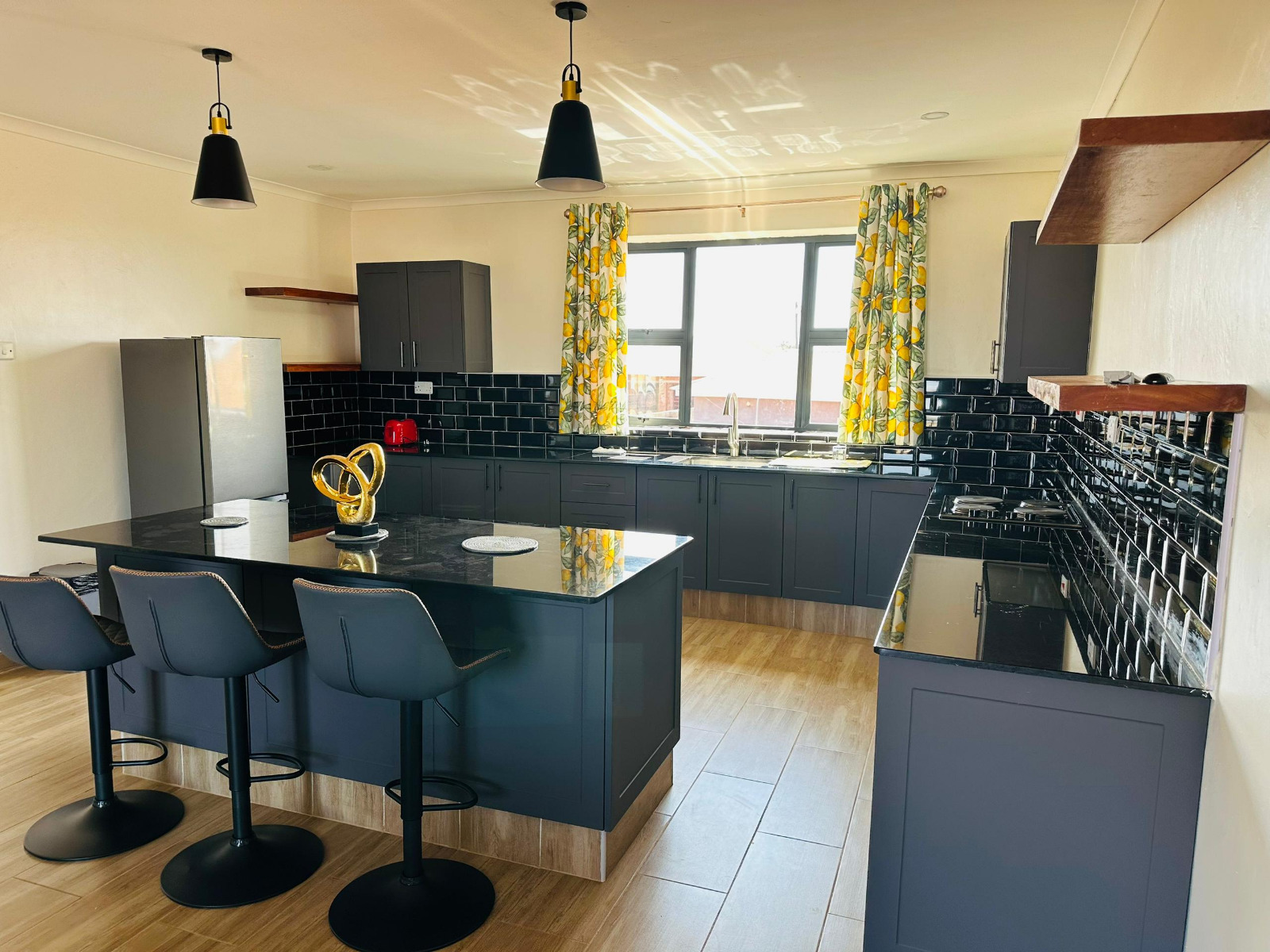Dining table (Island), Stove, Refrigerator, Microwave, Electric kettle, Toaster, Blender, Coffee maker, Kitchenware.